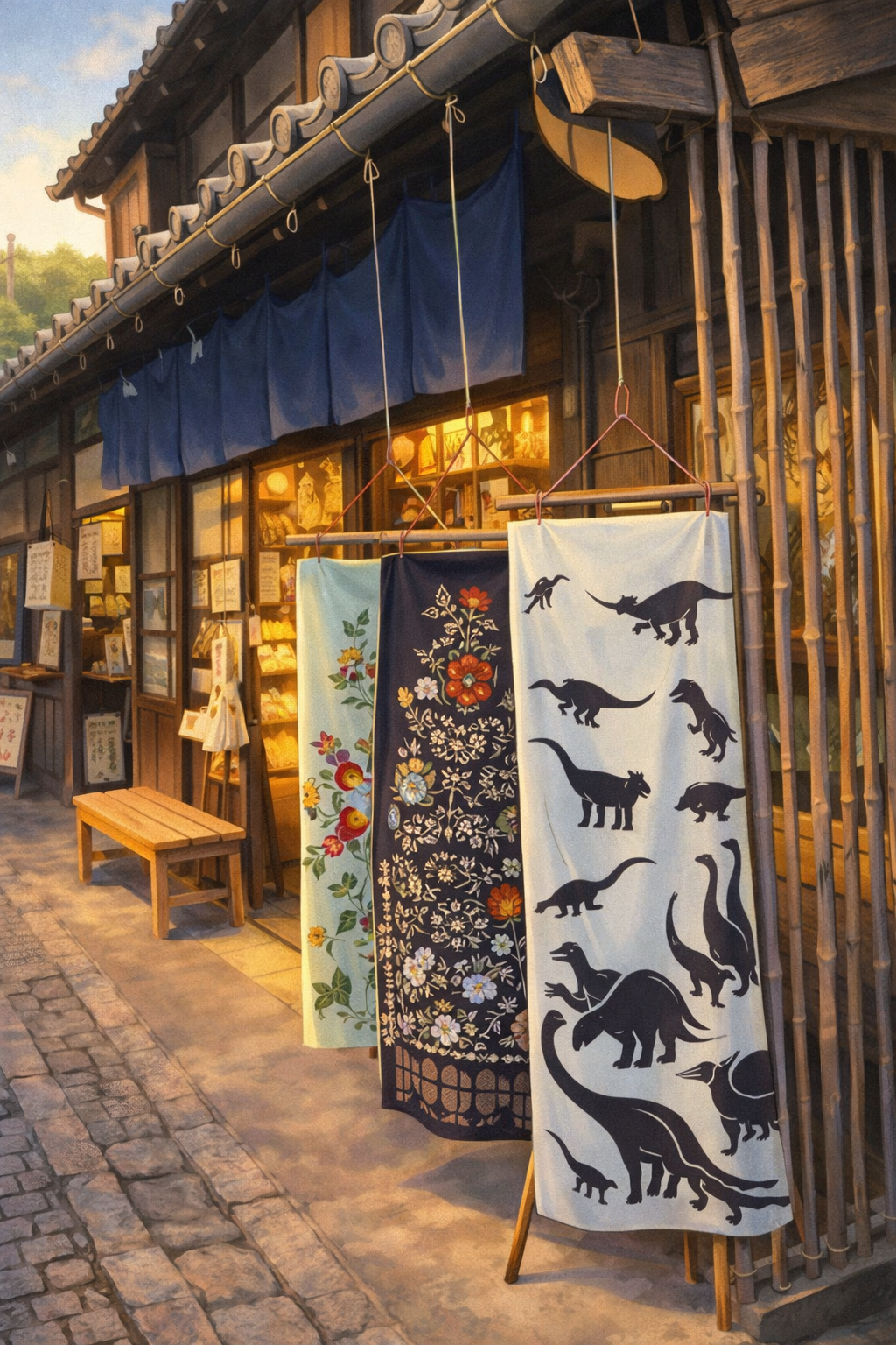 A tenugui reflecting the current season is displayed in front of the shop, and many people enjoy seeing how its expression changes each time they pass by.